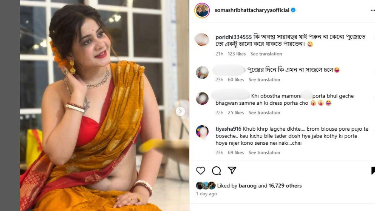 নিজের নতুন বাড়িতে কালীপুজোর আয়োজন করেছিলেন সোমাশ্রী। কালীপুজোর বেশ কিছুদিন পর শুক্রবার বাড়ির পুজো ও নিজের কিছু ছবি শেয়ার করেন সোমাশ্রী। যেখানে তিনি বিকিনি টাইপ ব্লাউজের ওপর হলুদ রঙের শাড়ি পরেছেন। খোলা বুঁকে উঁকি মারছে প্রজাপতি ট্যাটু, উন্মুক্ত নায়িকার পেট। মা কালীর সামনে অভিনেত্রীকে এইভাবে বসে থাকতে দেখেই চটে লাল নেটপাড়ার একাংশ। শালীনতার পাঠ শেখালেন তাঁকে।