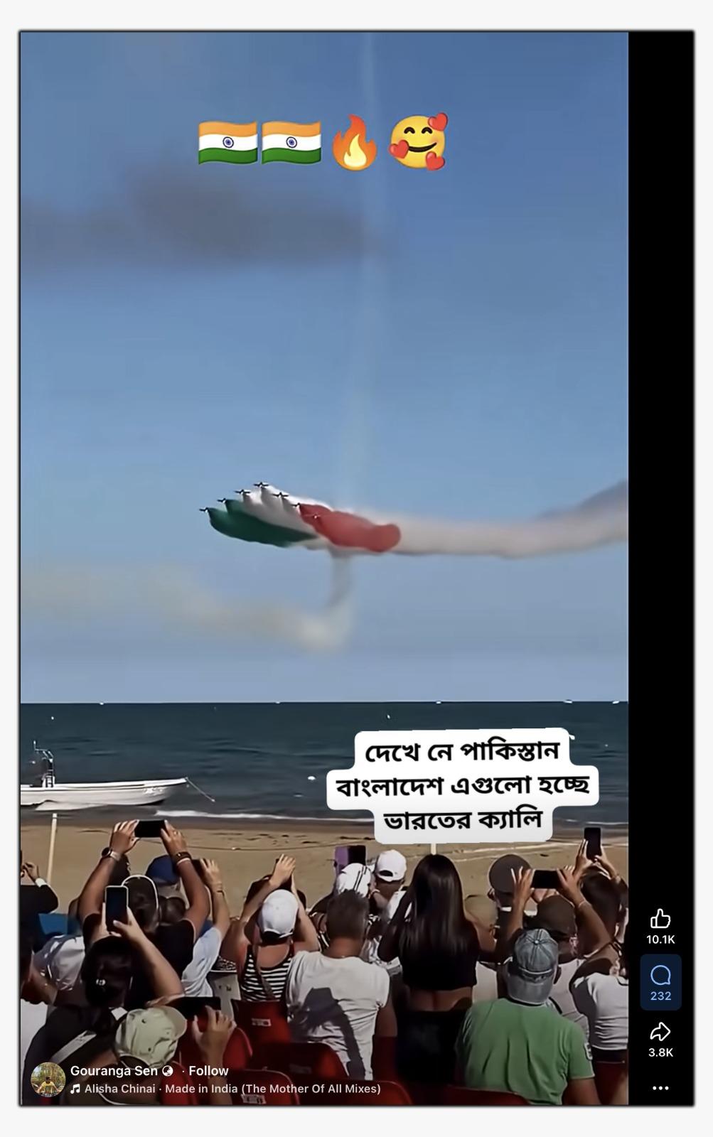 ভাইরাল ভিডিওটি কোনও সমুদ্রপৃষ্ঠের কাছে। যেখানে সৈকত এলাকায় দর্শকের দাঁড়িয়ে ভিডিও রেকর্ড করতে দেখা যাচ্ছে সেই সঙ্গে বিমানবাহিনী আকাশ তেরঙ্গা রঙের ধোঁয়া দিয়ে ঢেকে দিচ্ছে। ভিডিওটি পোস্ট করে এর ওপর লেখা হয়েছে, “দেখে নে পাকিস্তান বাংলাদেশ এগুলো হচ্ছে ভারতের ক্যালি।”