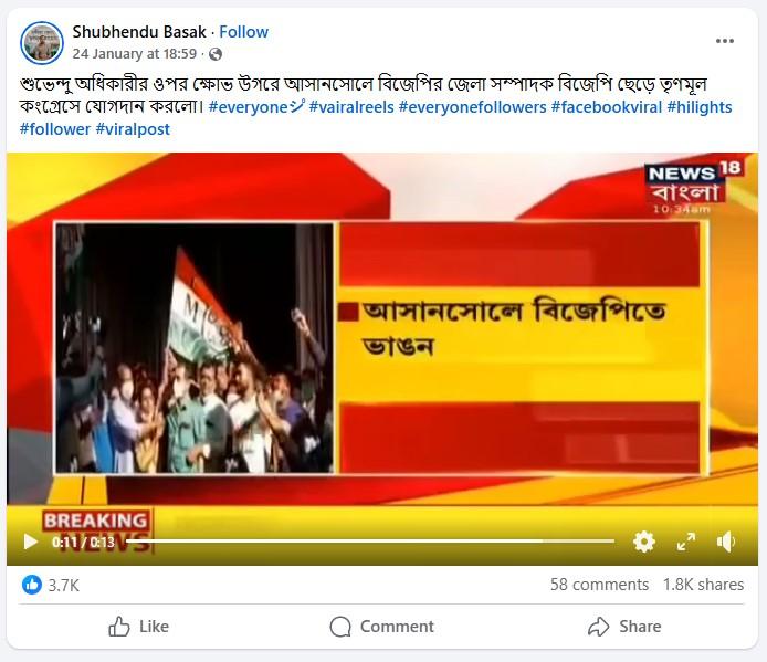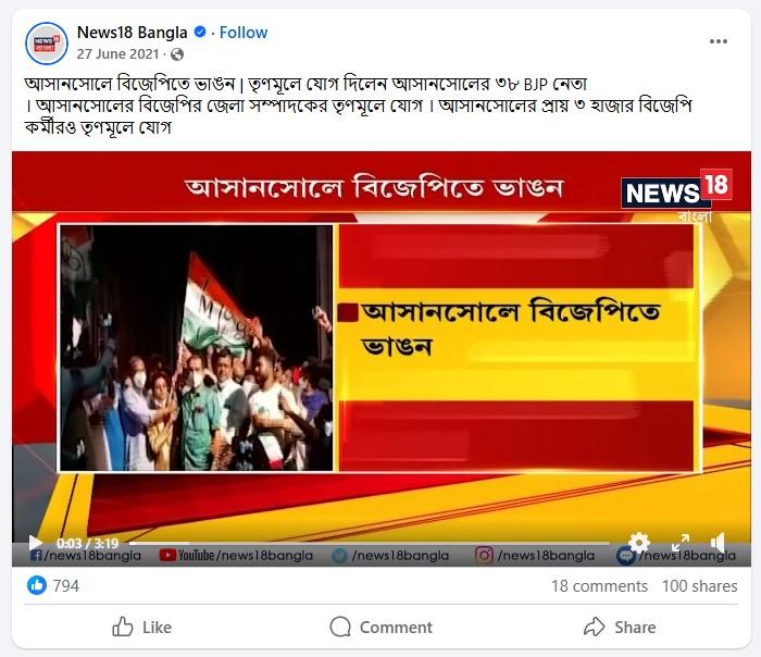 উদাহরণস্বরূপ, এক ফেসবুক ব্যবহারকারীর তরফে শেয়ার করা নিউজ-১৮ বাংলার প্রথম ক্লিপটিতে উপস্থাপককে বলতে শোনা যাচ্ছে, আসানসোলে বিজেপি ছেড়ে তৃণমূলে যোগ দিয়েছে দলের জেলা সম্পাদক এবং ৩৮ জন নেতা-সহ মোট ৩ হাজার কর্মী। ক্লিপটি শেয়ার করে লেখা হয়েছে, “শুভেন্দু অধিকারীর ওপর ক্ষোভ উগরে আসানসোলে বিজেপির জেলা সম্পাদক বিজেপি ছেড়ে তৃণমূল কংগ্রেসে যোগদান করলো।”