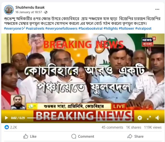ওই একই ব্যক্তি নিউজ-১৮ বাংলার অন্য একটি ক্লিপ শেয়ার করেছেন। ক্লিপ অনুযায়ী, কোচবিহারের তুফানগঞ্জ -১ নম্বর ব্লকের অন্দরান ফুলবাড়ি -১ নম্বর পঞ্চায়েতের ৪ জন বিজেপি পঞ্চায়েত সদস্যকে তৃণমূলে যোগ দিয়েছেন। ক্লিপটি শেয়ার করে তিনি প্রায় একই রকম দাবি করে লিখেছেন, “শুভেন্দু অধিকারীর ওপর ক্ষোভ উগরে কোচবিহারে গ্রাম পঞ্চায়েত হাত ছাড়া বিজেপির চারজন বিজেপির পঞ্চায়েত মেম্বার তৃণমূল কংগ্রেসে যোগদান করলো এর ফলে বোর্ড গঠন করলো তৃণমূল কংগ্রেস।”