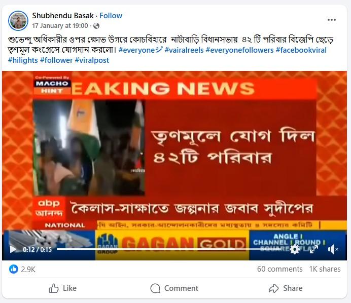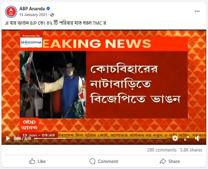 তৃতীয় ক্লিপ: সব শেষে এবিপি আনন্দের প্রতিবেদন অর্থাৎ তৃতীয় নিউজ ক্লিপটি নিয়ে অনুসন্ধান চালালে ২০২১ সালের ১৩ জানুয়ারি এবিপি আনন্দের অফিশিয়াল ফেসবুক পেজে এই একই ভিডিও-র বর্ধিত সংস্করণ-সহ একটি পোস্ট পাওয়া যায়। পোস্টের ক্যাপশনে লেখা হয়েছে, “এ বার ভাঙন BJP তে। ৪২ টি পরিবার হাত ধরল TMC র।” পাশাপাশি, প্রতিবেদনটি থেকে জানা যায়, কোচবিহারের নাটাবাড়ি ব্লকের বলরামপুরে বিজেপি ছেড়ে তৃণমূলে যোগ দেয় ৪২টি পরিবার। তাদের হাতে তৃণমূলের দলীয় পতাকা তুলে দিয়েছিলেন তৎকালীন উত্তরবঙ্গ উন্নয়ন মন্ত্রী রবীন্দ্রনাথ ঘোষ। মন্ত্রী দাবি করেন, বিজেপি-র প্রতি বীতশ্রদ্ধ হয়ে এই পরিবারগুোল তৃণমূলে যোগদান করেছিল।