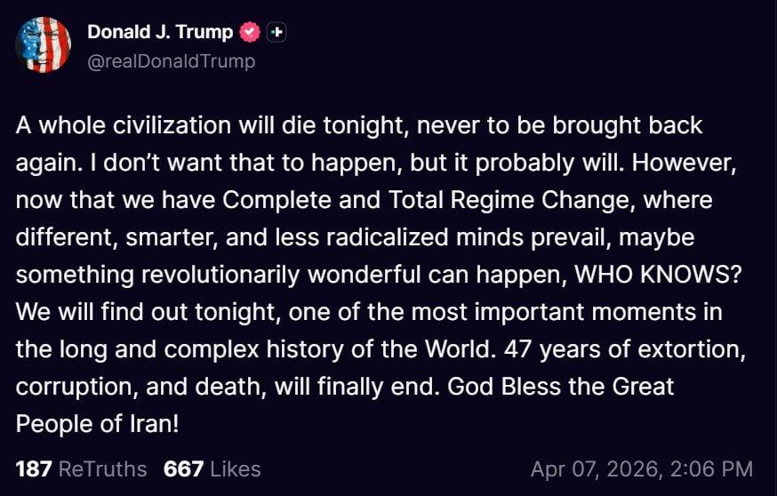 আজ ডোনাল্ড ট্রাম্প তাঁর সোশ্যাল মিডিয়া সাইটে লিখেছেন, 'একটি সম্পূর্ণ সভ্যতা আজ রাতেই ধ্বংস হয়ে যাবে। আর কখনও ফিরে আসবে না। আমি চাই না তা ঘটুক, কিন্তু সম্ভবত তা ঘটবেই। তবে এখন যেহেতু আমরা সম্পূর্ণ ও সর্বাত্মক শাসন পরিবর্তনের পথে, যেখানে ভিন্ন, আরও বুদ্ধিমান এবং কম চরমপন্থী মানসিকতা প্রাধান্য পাবে, হয়তো অসাধারণ কিছু ঘটতে পারে, কে জানে? আমরা আজ রাতেই জানতে পারব। এটি বিশ্বের দীর্ঘ ও জটিল ইতিহাসের অন্যতম গুরুত্বপূর্ণ মুহূর্ত। ৪৭ বছরের চাঁদাবাজি, দুর্নীতি এবং মৃত্যুর অবসান অবশেষে ঘটবে। মহান ইরানের জনগণকে ঈশ্বর আশীর্বাদ করুন!'
